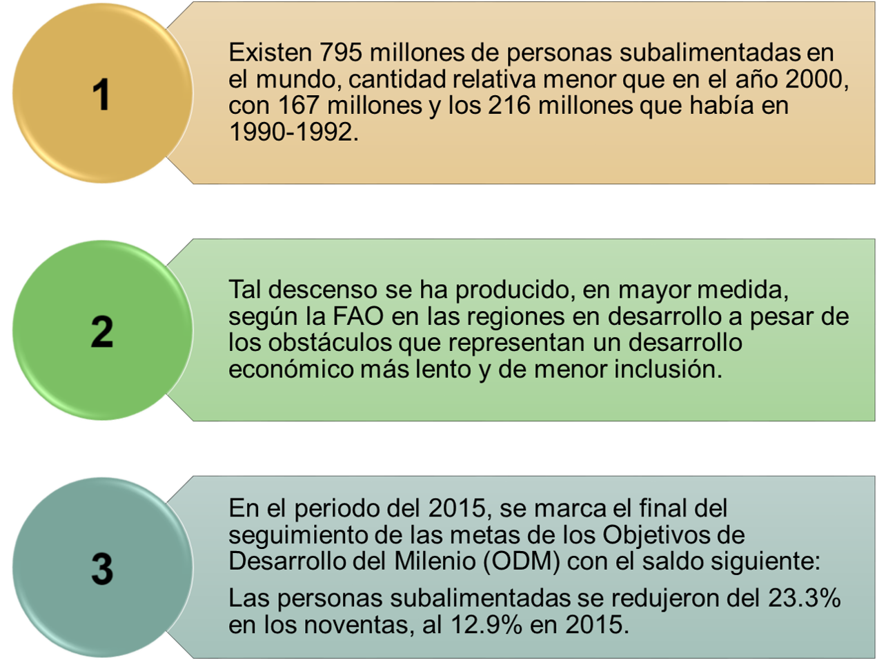 Revisaremos, en términos de la seguridad alimentaria, el saldo que arroja el informe anual de la FAO (2015), que pone en relieve aquellos rubros de más importancia que se produjeron en el año 2015 y que a continuación señalaremos:
