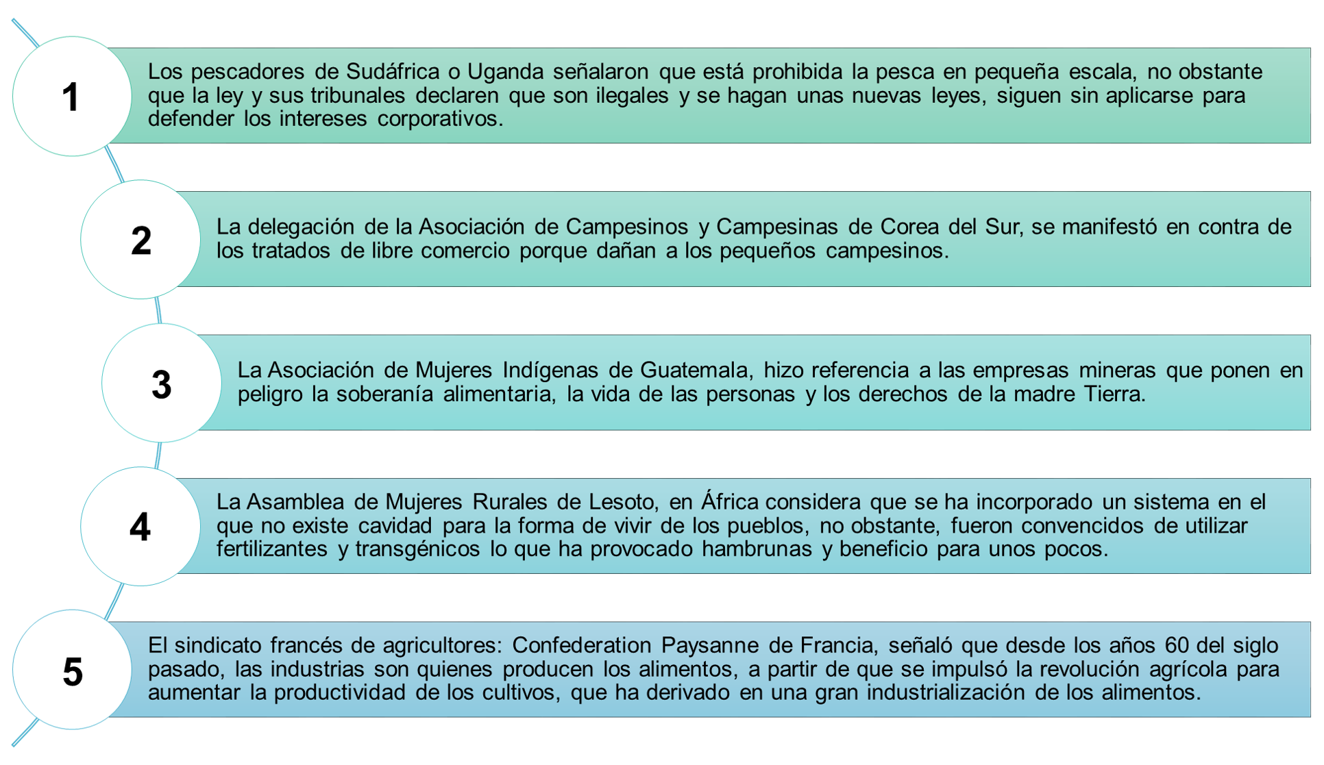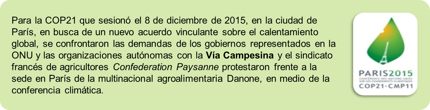 La organización de campesinas, campesinos, trabajadores y trabajadoras (Vía campesina, 2015) ha reunido diferentes enfoques ante la conferencia climática COP21 donde se expresaron las demandas de diversos grupos que consideran se pone en riesgo la soberanía alimentaria misma. Manifestaron que ésta: