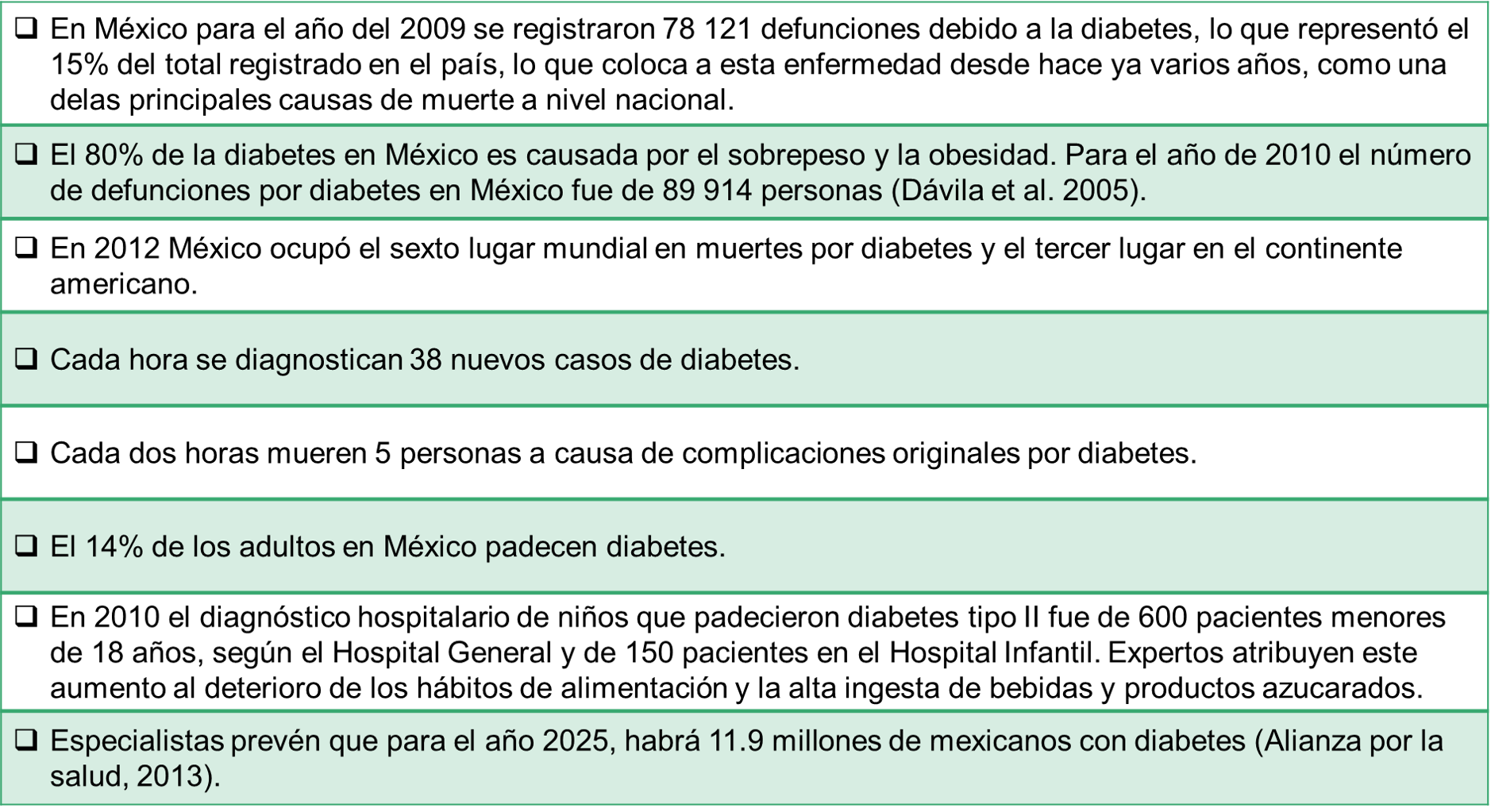 http://alianzasalud.org.mx/2013/05/diabetes-1-causa-de-muerte-en-mexico/ - Arellanes Cancino, N. y Sosa Perdomo, A. (s.f.). Comer, curar y adornar: prácticas culturales y seguridad alimentaria en los huertos familiares de Michoacán, México. Cátedras CONACYT, Proyecto 2271. Instituto Tecnológico de Oaxaca.