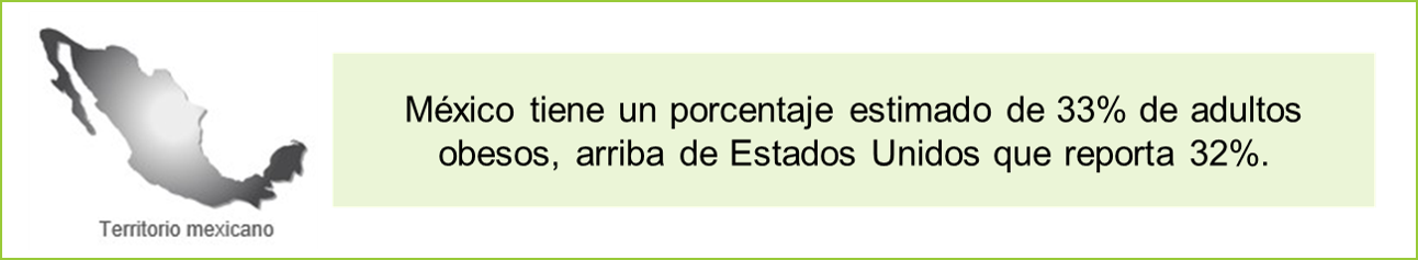 El número de personas obesas y con sobrepeso en México se ha triplicado durante los últimos 30 años: actualmente, más del 71% de la población adulta tiene exceso de peso corporal (European Food Information Council, 2006), 40% sobrepeso (dato basado en el índice de masa corporal (IMC) > 25 kg/m2, pero < 30 kg/m2) y 32% obesidad.