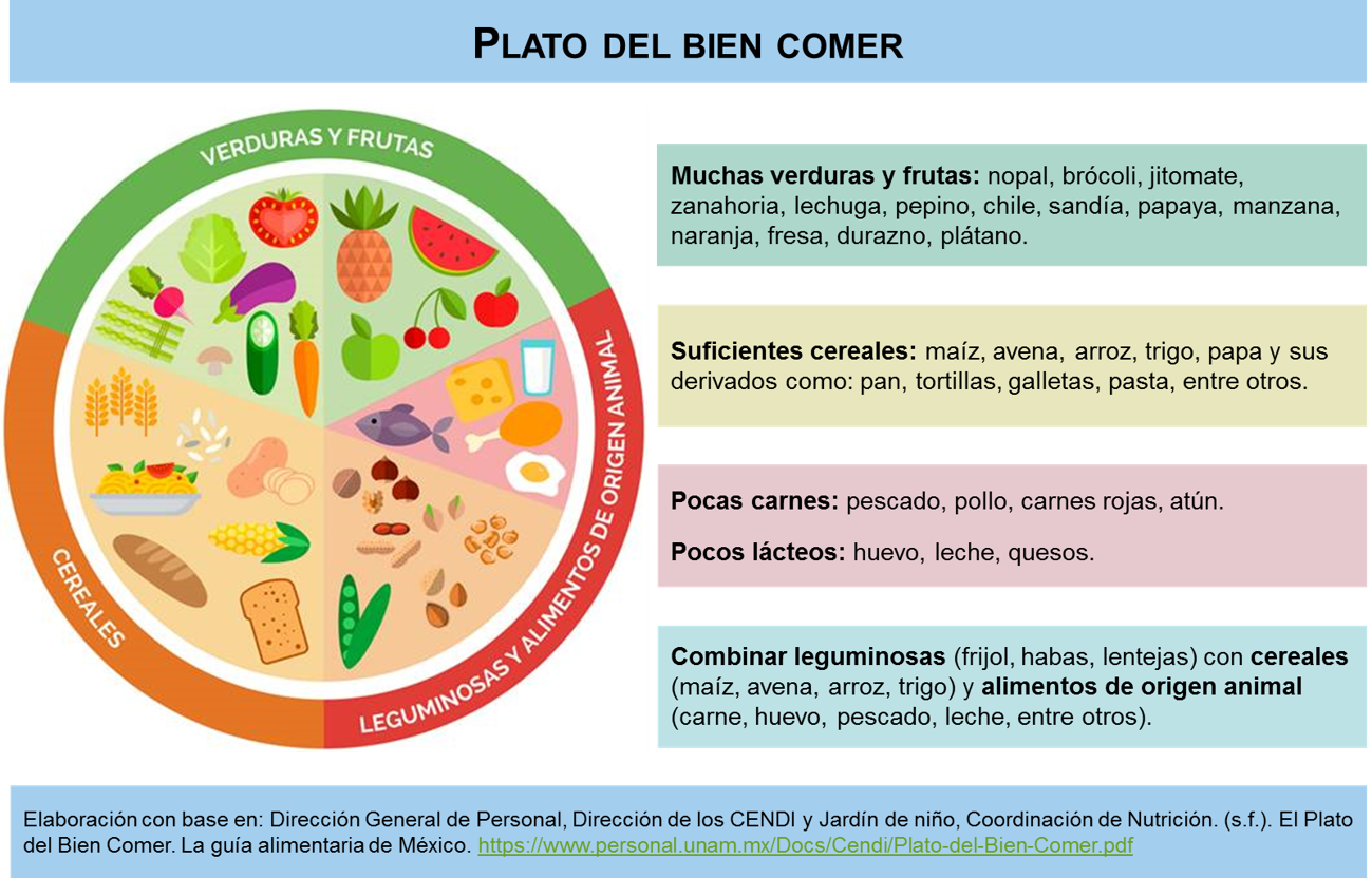 - Dirección General de Personal, Dirección de los CENDI y Jardín de niño, Coordinación de Nutrición. (s.f.). El Plato del Bien Comer. La guía alimentaria de México. México, UNAM. https://www.personal.unam.mx/Docs/Cendi/Plato-del-Bien-Comer.pdf