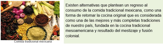 Sin embargo, es importante referirnos al rescate del consumo de la comida tradicional mexicana, fuente de aportaciones de la cultura mesoamericana al mundo, junto con las técnicas para obtenerlos y la manera de cocinarlos.
